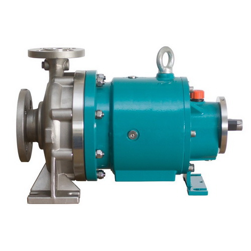 磁力泵由泵體、葉輪、內磁鋼外磁鋼、隔離套、泵內軸泵外軸、滑動軸承滾動軸承、聯軸器、電機、底座等組成(有些小型的磁力泵,將外磁鋼與電機軸直接聯在一起,省去泵外軸、滾動軸承和聯軸器等部件)。磁力傳動在離心泵上的應用與一切磁傳動原理一樣,是利用磁體能吸引鐵磁物質以及磁體或磁場之間有磁力作用的特性;而非鐵磁物質不影響或很少影響磁力的大小,因此可以無接觸地透過非磁導體(隔離套)進行動力傳輸,這種傳動裝置稱為磁性聯軸器。電動機通過聯軸器和外磁鋼聯在一起,葉輪和內磁鋼聯在一起。在外磁鋼和內磁鋼之間設有全密封的隔離套,將內、外磁鋼完全隔開使內磁鋼處于介質之中,電動機的轉軸通過磁鋼間磁極的吸力直接帶動葉輪同步轉動