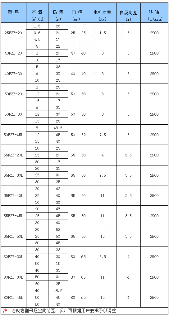 FZB自吸泵的過流部件全部采用氟塑料制造,且又具有自吸功能,因此,FZB自吸泵的用途極為廣泛,如:將地下槽中的腐蝕性液體抽送至目標地點,將底端無出口的酸堿槽中的酸堿抽送到目標地點,或用于多個酸槽之間的循環,或用于卸酸等等。